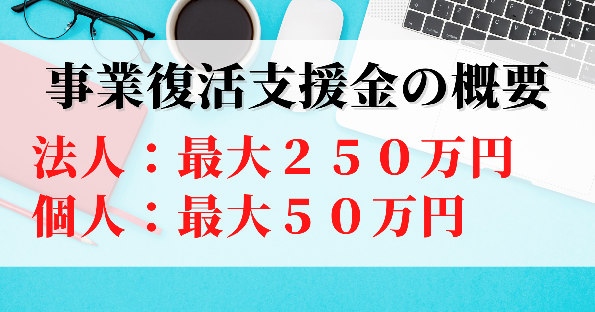 事業復活支援金の概要について 公開日:2022年1月7日 補助金・助成金 皆さんも報道などでご存じのことと思われますが、最大250万円の「事業復活支援金」が実施されることになりました。 正確には、法人は上限最大250万円、個人事業主は上限最大50万円が給付されます。 いずれ事務局のホームページ […] 続きを読む
